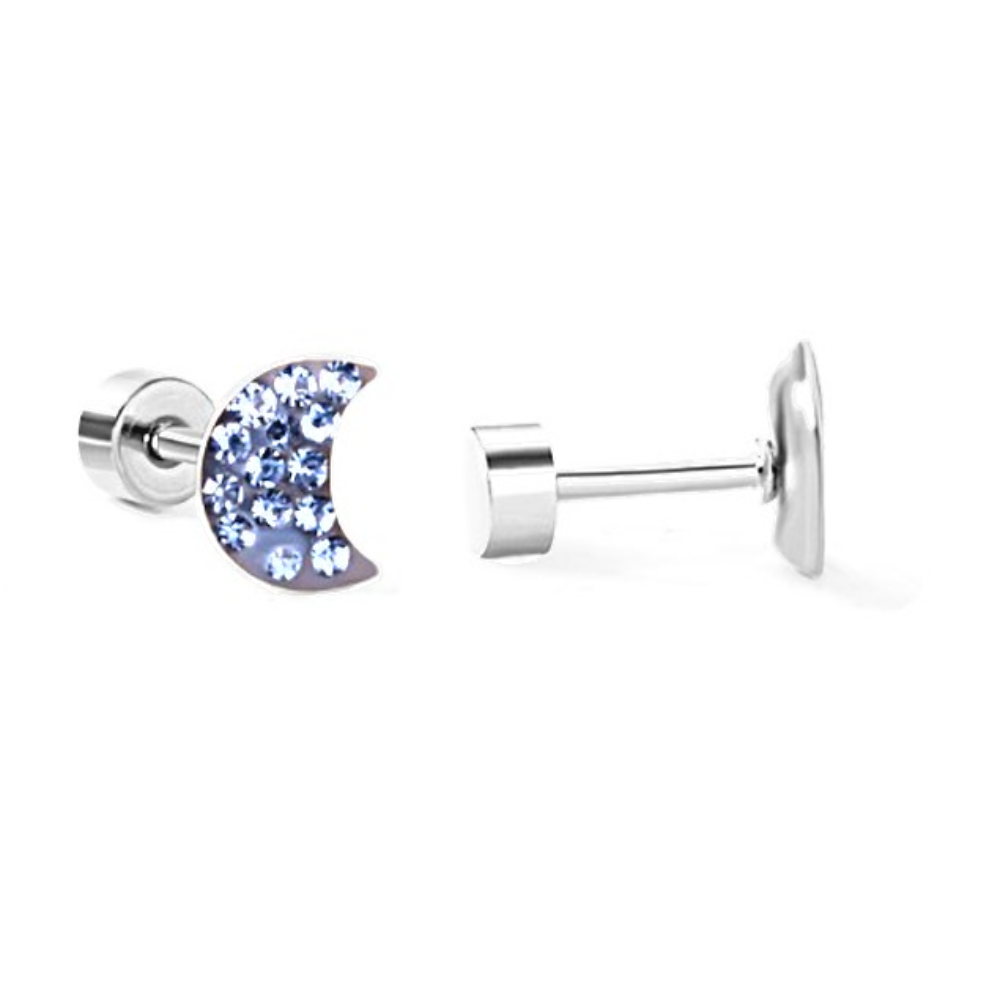 These dazzling moon flatback studs feature a crescent moon adorned in sparkling gems. These moon-shaped earrings are made of surgical steel. They are also nickel, copper, and lead free and are perfect for anyone that is concerned about their sensitive skin. Our hypoallergenic materials in combination with our flat screw-back design allows you to be able to play, sleep, and sparkle confidently knowing that your favorite pair of earrings are comfortable, safe, secure, and most importantly wont irritate your skin.